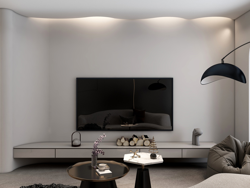 客厅空间采用多弧形的细节设计,将空间展现的更加温润舒适,悬空电视柜的设计提升时尚感。