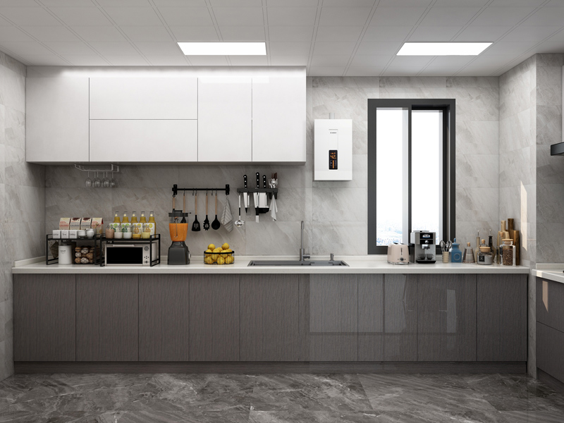 厨房空间采用L形的橱柜布局,保证操作空间的舒适宽敞,吊柜与地柜的色彩碰撞,避免空间单调,更富层次。