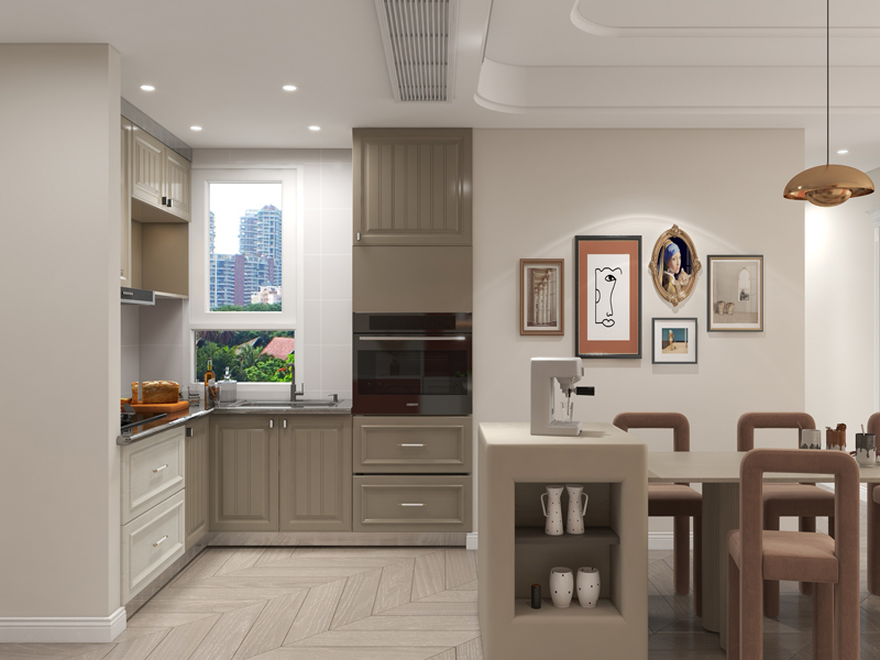 餐厅区域采用岛台一体设计,提升区域使用体验感与功能性,增设餐边柜,满足区域储物需求,增强实用性。