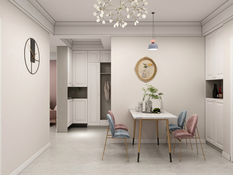 本案例风格定位于简约美式,清新活力的粉调搭配使空间浪漫温柔,打造出精致清爽的简美风格。