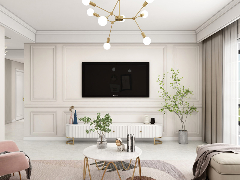 客厅电视背景墙采用石膏线设计,带来稳重且富有韵律的感觉,绿植的融入增添空间自然与活力。