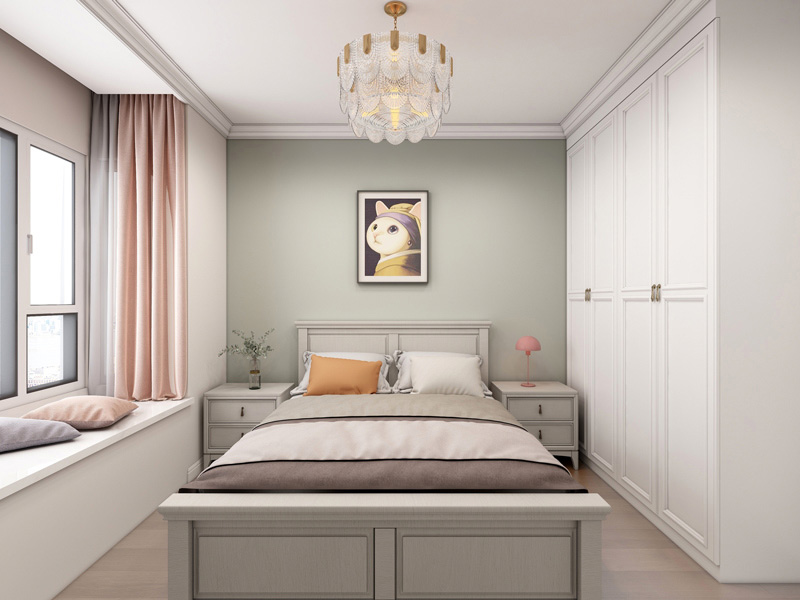 卧室营造出唯美温馨的睡眠环境,整面衣柜保证区域收纳功能,飘窗的设计为空间带来惬意之感。