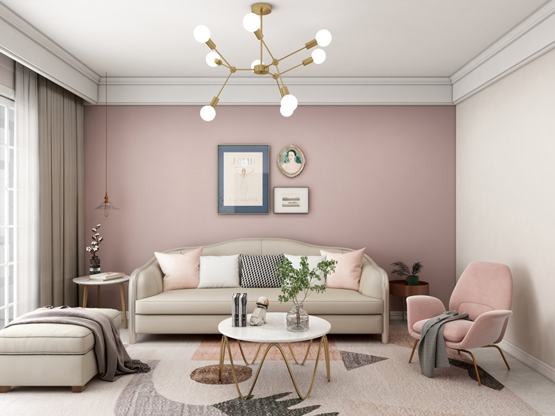 沙发背景墙整面粉色墙面带来浪漫唯美的氛围,艺术装饰画的融入带来精致感,优雅中传达时尚。