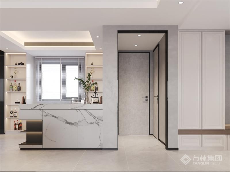 • 入户便直面疏阔的空间,客厅、餐厅、西餐岛台一览无余。视觉上规划有序,提升舒适度的同时将空间得以释放,满足居者的社交会客属性。