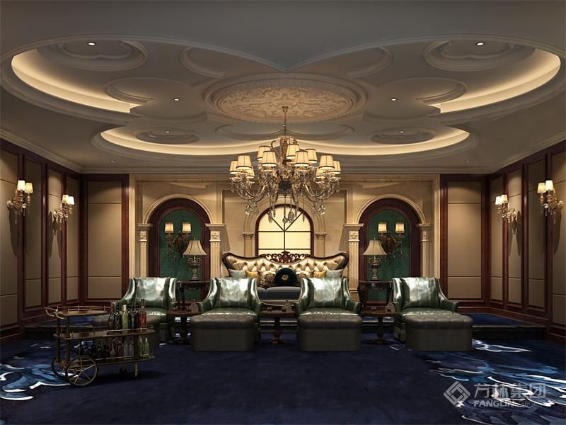在客厅设计上,可能会有高挑的天花板,大型的水晶吊灯悬挂其中,照亮整个空间。墙壁可能会装饰着华丽的壁纸或墙板,配以精致的线条和雕刻。