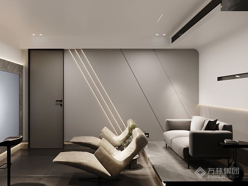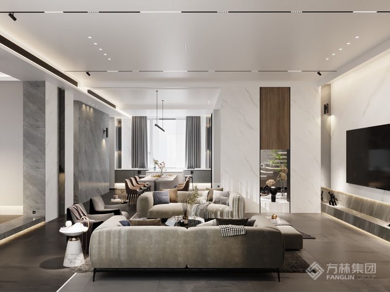 元素单纯化,体量关系简洁化,加之无主灯设计,即使是深色的空间也毫无冗杂之感。沙发、地毯等软饰以布艺为主,能够很好的柔和大理石,饰面板材的硬朗。
